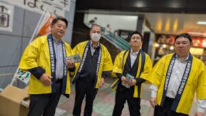 木更津駅東口にて寒い中地震保険普及活動でチラシとポケットティ